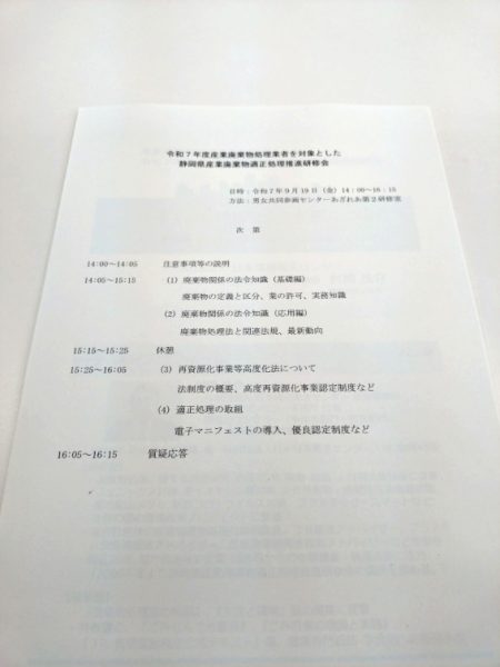 令和7年9月19日(金)14時〜静岡市葵区の男女共同参画センターあざれあに於いて、静岡県産業廃棄物適正処理推進研修会に県知事認可の産業廃棄物収集運搬事業者として参加してきました。