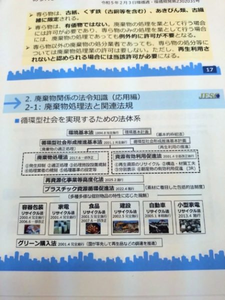 昨今日々産業廃棄物処理の法律、法令が更新され今まで処分廃棄がリサイクルや再生資源に変更になっているので、定期的な受講が必要となります。
