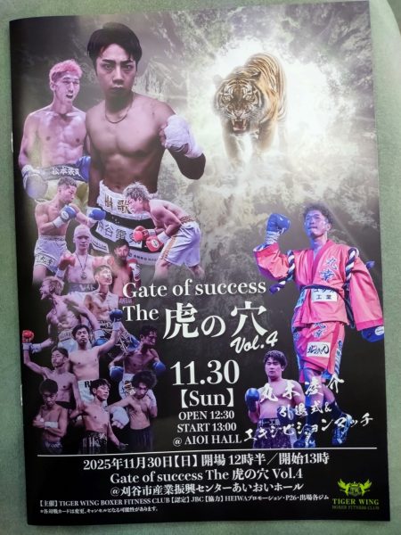 令和7年11月30日(日)13時〜愛知県刈谷市産業振興センターあいおいホールに於いて、TIGER WING BOXER FITNESS CLUB(タイガ-ウイニング ボクサ- フィトネス クラブ)中野 博会長様主催興行 The 虎の穴vol4に西遠ジム所属 中井裕人選手が出場のため、マネージャー業務で帯同しました。