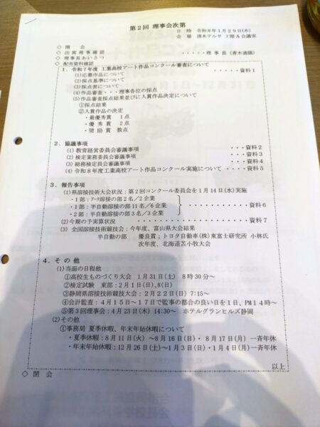 令和8年1月29日(木)14時〜静岡市清水区にある静岡市東部勤労者福祉センター テルサ清水に於いて、令和7年度高校生アート作品コンクール審査会と静岡県溶接工業協同組合 第2回理事会が開催されました。